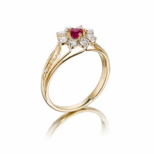 טבעת פרח עדינה ומקסימה משובצת במרכזה באבן רובי טבעית, ומסביבה יהלומים בוהקים ומנצנצים המשווים מראה זוהר ומיוחד.