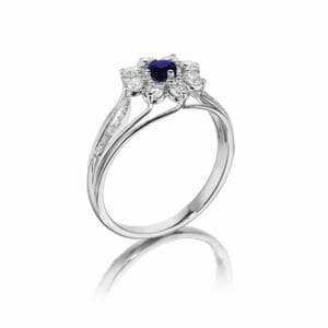 טבעת פרח זהב לבן עדינה ומקסימה משובצת במרכזה באבן ספיר טבעית, ומסביבה יהלומים בוהקים ומנצנצים המשווים מראה זוהר ומיוחד.