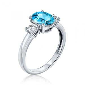 טבעת יהלומים משובצת במרכזה באבן בלו טופז אנרגטית ומדהימה, ולצידה זוג יהלומים איכותיים ונוצצים.