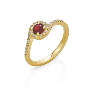 טבעת אלגנטית רובי משובצת יהלומים בעיצוב טוויסט יחודי בזהב צהוב.